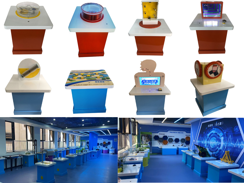 科技館由安全教育、人工智能與機器人、禁毒體驗、法制教育、數學、電磁學、力學、光學、聲學、生命科學、新能源、地球科學、軍事科技、航天航空、航海、環境保護和海洋世界等方面的系列儀器組成。這些儀器集科學性、知識性、趣味性、操作性于一體,將光的反射、聲的傳播、力的分解、電的產生、水的循環、能的轉化、磁場變化等自然常識和科學原理以最直觀的形式演示出來。學生親自操作,動腦動手,發現其中的奧妙,掌握其中的科學原理!