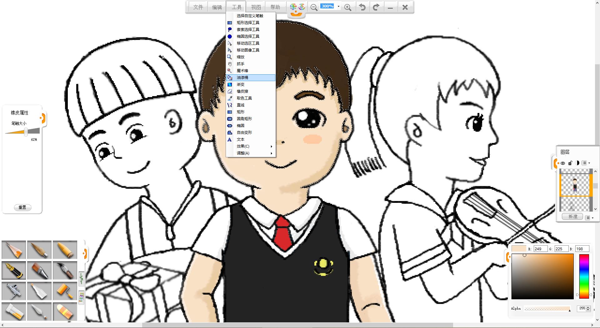 9.開始為人物上色。使用工具菜單下的魔術(shù)棒工具選擇閉合區(qū)域后,在新圖層中使用油漆桶工具進(jìn)行上色,再使用鉛筆工具補(bǔ)充細(xì)節(jié)。