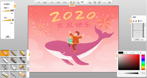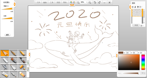 第四步:現(xiàn)在就開始在新建的透明圖層上繪制草圖。用左下角畫筆面板中的“鉛筆”工具,在筆觸上方畫筆屬性面板調(diào)節(jié)好筆刷的大小和軟硬度,開始繪制草圖。注意構(gòu)圖,圖像的疏密關(guān)系以及圖文的組合。大大的“2020”可以使用蠟筆筆觸重點突出啦。