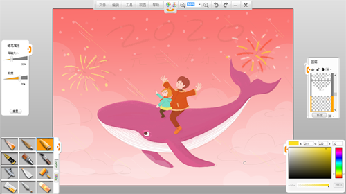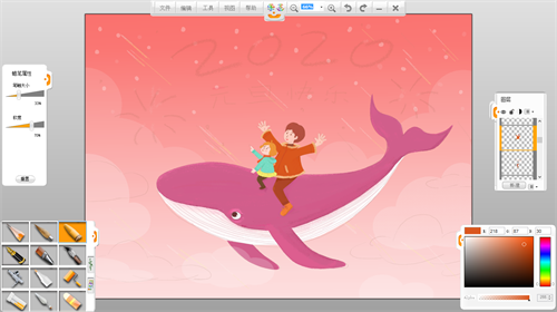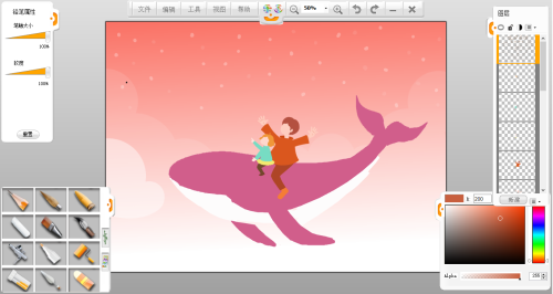 第五步:整體上色。新建圖層,確定整幅畫面的色調(diào),這一步可以暫時忽略細節(jié),把注意力放在確定大的色塊上,考慮主體色調(diào)和整體的顏色效果。背景使用樂畫軟件主菜單欄的工具中的“漸變工具”進行填色,云彩用“橢圓工具”選中區(qū)域后用“油漆桶工具”填色并調(diào)節(jié)所在圖層的透明度,鯨魚用蠟筆筆觸填色,邊緣適當使用“橡皮擦工具”修整。