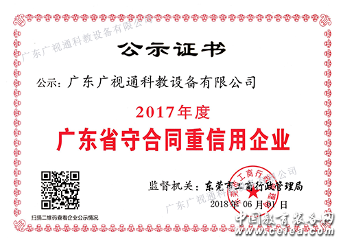 近日,廣東廣視通科教設備有限公司順利通過了廣東省工商行政管理局評審,獲得了2017年度“廣東省守合同重信用企業”榮譽稱號,這也是廣視通第7次獲此殊榮,此前廣視通曾在2010年度、2012年度、2013年度、2014年度、2015年度、2016年度六年獲得該榮譽稱號。