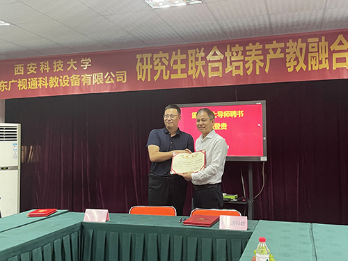 座談會結束后,西安科技大學管理學院副院長鄒紹輝、廣東廣視通科教設備有限公司董事長陳登貴分別代表雙方簽訂共建“研究生聯合培養產教融合實踐基地”合作協議并進行授牌,鄒紹輝副院長為陳登貴董事長及實踐基地建設團隊導師頒發校外碩士導師聘書。