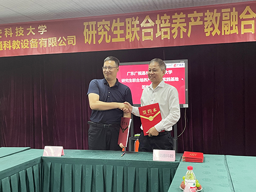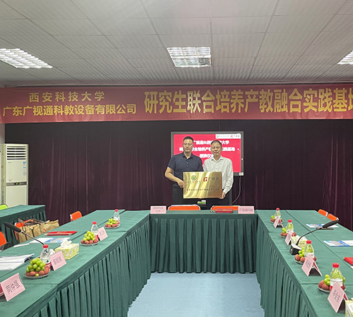2023年7月8日下午,廣東廣視通科教設備有限公司與西安科技大學“研究生聯合培養產教融合實踐基地”簽約儀式在廣視通大廈二樓會議室舉行。西安科技大學管理學院副院長鄒紹輝,西安科技大學大灣區研究生聯合培養產教融合實踐基地導師羅立升,西安科技大學大灣區MBA校友會籌備組秘書長、東莞市市場監督管理局石排分局同仲強,大灣區西安科技大學MBA校友會籌備組委員陳桂;特邀嘉賓廣東科技學院黨委副書記、副校長畢會東,東莞市名校研究生培育發展中心林洪嘉;公司董事長陳登貴、副總經理吳斌華、副總經理潘富兵等出席簽約儀式。由西安科技大學大灣區研究生聯合培養產教融合實踐基地導師羅立升主持簽約活動。