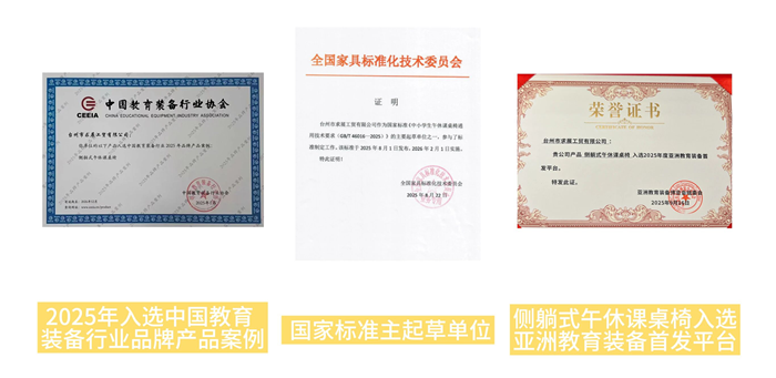 公司擁有一百五十多項(xiàng)課桌椅專利,其中課桌椅發(fā)明專利有十多項(xiàng)。公司榮獲“浙江省AAA級守合同重信用企業(yè)”,“人體工效學(xué)認(rèn)證證書”等成就。公司是國家標(biāo)準(zhǔn)GB/T 46016-2025《中小學(xué)生午休課桌椅通用技術(shù)要求》主要起草單位,也是午休課桌椅團(tuán)體標(biāo)準(zhǔn)起草單位。