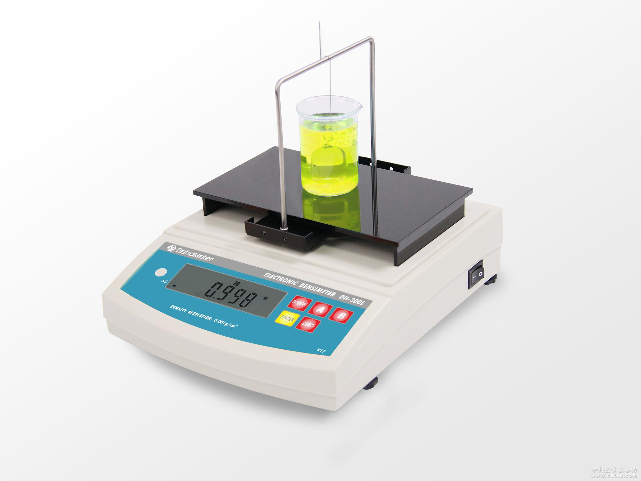 技術指標: 品牌:DahoMeter 達宏美拓 品名/型號:液體密度計DH-300L 密度精度:0.001 g/cm3 密度范圍:0.001—99.999g/cm3 測量種類:a:流動性液體、粘稠性液體、揮發性液體、腐蝕性液體、高溫液體、懸浮性液體、乳化液體…等多種狀態液體 b:酒精、助焊劑、香精、血液、氯化鈉、甘油、電解液、柴油、制冷劑、氫氟酸、二氯甲烷、乙醚、硫酸…等相似狀態液體皆可測量 測量原理:阿基米德原理 測量模式:1組 測量時間:即時測量 記憶方式:動態記憶 結果顯示:密度值 比重測量架:304不銹鋼比重測量架 功能設定:溫度設定、溶液密度設定、標準測量砝碼重量值與水中重量值的設定 校正方式:單鍵自動校正、自動檢測之功能 驗正方式:蒸餾水驗正 輸出方式:RS-232C標準通信接口、方便測試數據輸出與打印 標準附件:①主機、②測量放置板、③DE-20A標準液體測量組件、④鑷子、⑤溫度計、⑥100G砝碼、⑦防風防塵罩、⑧測量支架、⑨電源變壓器一個
