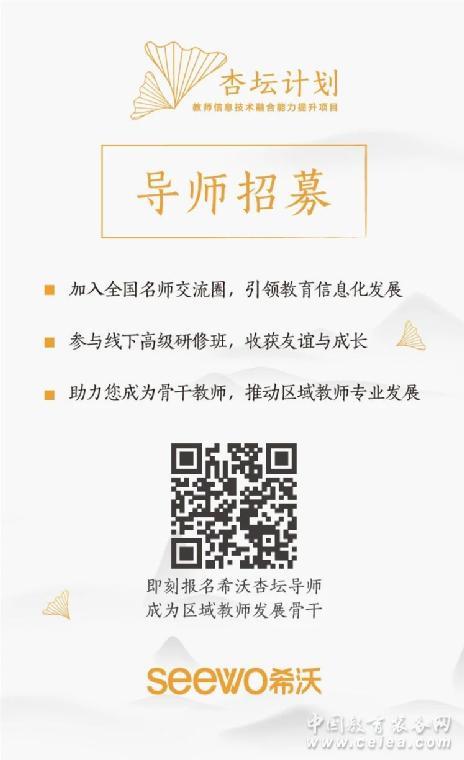 教育的發展需要更多的力量,我們希望更多老師能加入到希沃“杏壇計劃”的行列,發揮榜樣教師的力量,與中國教育共同成長。點瑟回琴杏壇中,期待您的加入,讓教育信息化之音更加響亮。