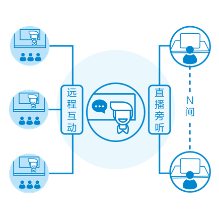 考慮到全國范圍內(nèi)教育信息化建設(shè)不均衡、教學(xué)環(huán)境條件有差異的情況,同時為滿足“一帶多”的遠程互動需求,希沃互動錄播方案采用了常規(guī)錄播交互和直播旁聽結(jié)合的“無邊界”互動方式。即1個授課教室,可以同時連接3個遠程教室進行遠程互動,同時還能通過直播鏈接或二維碼的分享,滿足多個旁聽觀摩需求,以提高優(yōu)課資源的利用率。