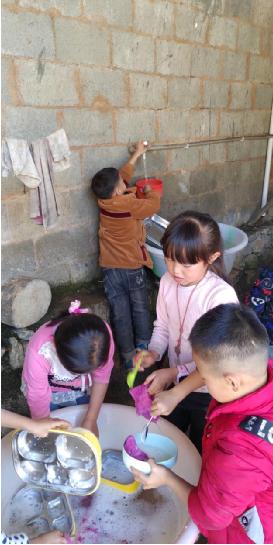 不一會兒孩子們上午的課程就結束了,因為孩子們離家比較遠,所以都會在學校吃午飯。那天剛好是一周一次的大掃除日,孩子們需要先清潔校園,然后才吃午飯。一個個比掃帚矮一大截的小朋友,沒人指揮、沒人監督,都自覺認真地清掃校園,當天的溫度在10度左右,我穿著羽絨服幫忙掃樹葉都覺得冷冷的,可是有的小朋友就穿了一兩件單薄的衣服,流著鼻涕,小手凍的紅紅的,還在地上撿樹葉、掃樓梯、擦門窗。看著一個個忙碌的小身影,我很心痛,到底是怎樣一種生活環境,才讓他們有著這般和年紀不符的成熟懂事啊。