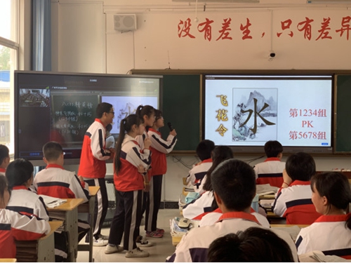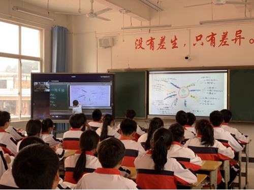 “不畏浮云遮望眼,只緣身在最高層!苯Y合交互智能錄播系統,遠在廣州的平沙培英學校語文老師為現場塘邊中學的同學們帶來了一節妙趣橫生的語文課《古詩苑漫步》。在老師的組織和指導下,學生們整齊地朗誦一首首古詩,并分組開啟了飛花令游戲;谙N纸换ブ悄茕洸崟r流暢的直播與大屏的畫面顯示,兩地師生呈現了一堂精彩生動的“遠程教育互動課堂”。