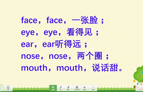 chant,一邊拍手打節(jié)奏,孩子們不知不覺就將本單元所學(xué)知識串聯(lián)并背誦下來了。例如,在學(xué)習(xí)三年級上冊第三單元時(shí),我自創(chuàng)的 chant“face,face, 一