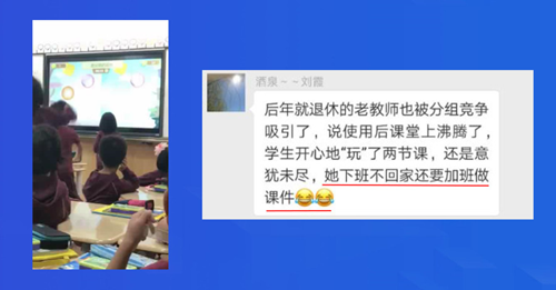下圖是西北一位老師在巡課的時候拍下來的,這個課是一位快退休的老師設計的,精彩的課堂活動讓他重新燃起了熱情。我們做這個的目的是,希望課堂不再是老師的單向灌輸,而是學生也能參與到課堂中來,通過游戲化的方式讓學生更好地記住知識點。