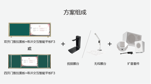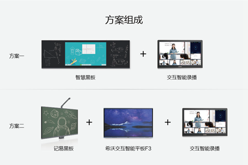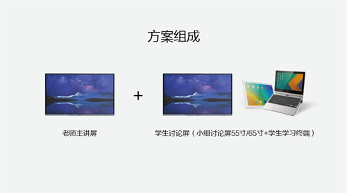 方案以大屏類產品為基礎,搭配推拉黑板、交互智能錄播、記易黑板、視頻展臺、擴音套件、環境監測儀等設備,輔以教學互動軟件、學生點評系統,讓老師教得更智能化,讓學生學得更個性化,讓師生互動更多元化。
