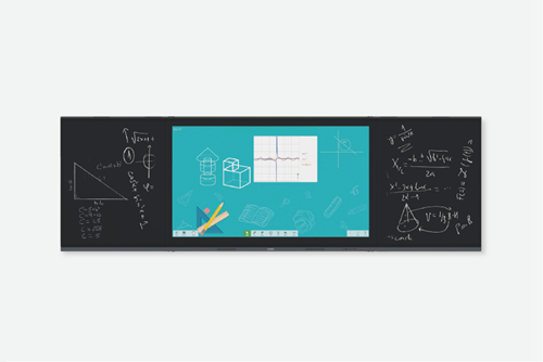 智慧黑板:集交互智能平板與黑板于一體,中間的主屏同時承擔著顯示與書寫功能,兩邊的黑板滿足傳統板書的需要。