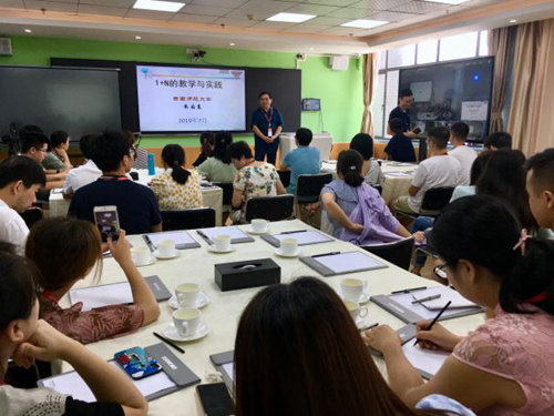 培訓(xùn)第二天,希沃邀請(qǐng)到云南師范大學(xué)的朱云東教授,為此次參與研修班的老師開展題為“此題目為《1+N的教學(xué)與實(shí)踐》的專題講座。朱教授結(jié)合自身教育教學(xué)經(jīng)歷,暢談信息化的必要性和深化發(fā)展,感慨教育信息化進(jìn)一步促進(jìn)教學(xué)均衡發(fā)展,因此堅(jiān)定不移推廣1+N教學(xué)模式。利用人工智能+教育,實(shí)現(xiàn)一校帶多校共通發(fā)展,其中數(shù)據(jù)分析、專家指導(dǎo)、加強(qiáng)教師信息化能力尤為重要,主講教師和助教教師協(xié)同合作,進(jìn)一步融合教學(xué)。