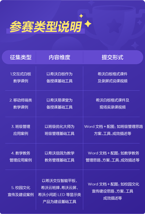 隨著老師們對于信息技術(shù)的應(yīng)用范圍越來越廣,今年的大賽征集作品根據(jù)不同的應(yīng)用情況,特分為五個類型:交互式白板教學課例、移動終端類教學課例、班級管理應(yīng)用案例、教學教務(wù)管理應(yīng)用案例、校園文化宣傳及建設(shè)案例。