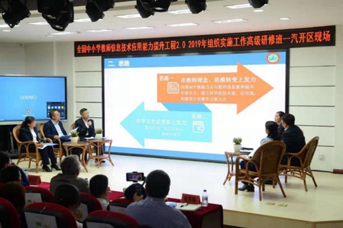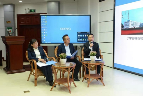 在汽開(kāi)區(qū)進(jìn)修學(xué)校趙越副校長(zhǎng)的主持下,校長(zhǎng)團(tuán)隊(duì)展示了“聚焦整校推進(jìn)尋求破解之道”主題論壇。第九中學(xué)李旦峰校長(zhǎng)分享了立足于頂層設(shè)計(jì),破解了2.0提升工程與學(xué)校整體規(guī)劃如何有機(jī)結(jié)合的問(wèn)題;第七小學(xué)鐘梅校長(zhǎng)、第十二小學(xué)王安巍校長(zhǎng)分別從研修模式重構(gòu)、研修方式重塑兩個(gè)維度談如何將2.0提升工程工程的實(shí)施與校本研修融合為一體的思考與策略;實(shí)驗(yàn)學(xué)校周國(guó)兵校長(zhǎng)、第一中學(xué)尤君志校長(zhǎng)分享了基于學(xué)校教師隊(duì)伍年齡偏大,如何破解老教師參與到2.0提升工程與技術(shù)應(yīng)用的問(wèn)題。其中均提到希沃對(duì)于學(xué)校信息化建設(shè)。