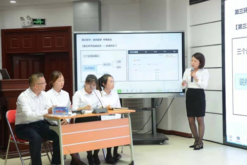 汽開(kāi)區(qū)第十三小學(xué)語(yǔ)文團(tuán)隊(duì)現(xiàn)場(chǎng)展示了基于信息技術(shù)支撐下的校本研修。研修采用了翻轉(zhuǎn)式、線上線下相融合的方式,圍繞如何引領(lǐng)孩子說(shuō)得精彩的核心問(wèn)題,破解了教育教學(xué)中的實(shí)際問(wèn)題,同步提升了教師的學(xué)科專業(yè)素養(yǎng)和信息技術(shù)應(yīng)用能力,提供了一個(gè)信息技術(shù)應(yīng)用能力提升工程與校本研修相融合的現(xiàn)場(chǎng)案例。其中教師匯報(bào)討論應(yīng)用的軟件為希沃白板5,利用了思維導(dǎo)圖以及板中板等功能實(shí)現(xiàn)歸納總結(jié),并應(yīng)用了希沃授課助手進(jìn)行同屏互傳,遠(yuǎn)程操控。