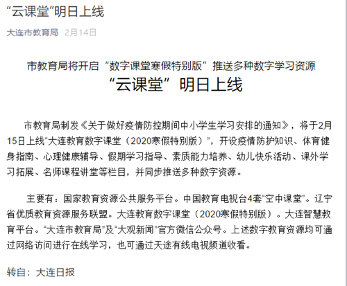 自疫情爆發以來,大連市教育局組織全市數百位教學名師精心制作,結合學生假期學習生活特點,推出了“大連教育數字課堂(2020寒假特別版)”,開設疫情防護知識、假期學習指導、名師課程講堂等欄目,并同步推送多種數字資源。