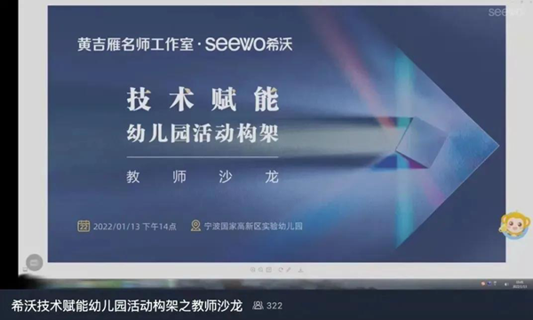 1月14日下午,由寧波國家高新區教育教學研究室、黃吉雁名師工作室主辦,希沃協辦的“技術賦能幼兒園活動架構的教師沙龍”在寧波國家高新區實驗幼兒園順利舉行,來自寧波市高新區8所幼兒園的15位教師參加了本次沙龍。與此同時,因為疫情早已放假的寧夏固原市隆德縣和原州區的300余位幼兒園老師們也通過云端在線觀摩了本次活動,并通過留言、二維碼答題等方式,和現場的老師們進行了互動。