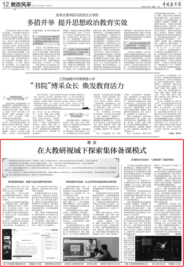 2023年1月3日,《中國(guó)教育報(bào)》第12版發(fā)表《希沃在大教研視域下探索集體備課模式》的文章中報(bào)道,希沃集體備課產(chǎn)品在不同教育主體、各個(gè)教育層級(jí)的實(shí)踐應(yīng)用中,探索出了全新的教研集備模式。以下為原文: