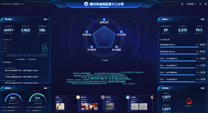 依托希沃綜合評(píng)價(jià)系統(tǒng),全面記錄學(xué)校德、智、體、美、勞教育場(chǎng)景下的學(xué)生學(xué)習(xí)實(shí)踐數(shù)據(jù),推動(dòng)學(xué)生數(shù)字檔案在評(píng)價(jià)中的應(yīng)用。基于學(xué)校辦學(xué)特色的學(xué)生評(píng)價(jià)體系設(shè)置評(píng)價(jià)維度,數(shù)據(jù)記錄次數(shù)39w+,產(chǎn)生道德品質(zhì)點(diǎn)評(píng)57461次,藝術(shù)素養(yǎng)點(diǎn)評(píng)10370次,學(xué)業(yè)發(fā)展點(diǎn)評(píng)69638次,身心健康點(diǎn)評(píng)33775次,勞動(dòng)實(shí)踐4394次,點(diǎn)評(píng)覆蓋率和教師參與率都達(dá)到了100%。同時(shí)學(xué)校運(yùn)用該評(píng)價(jià)體系發(fā)布62次校內(nèi)外實(shí)踐活動(dòng),參與學(xué)生共計(jì)1077人。在學(xué)生管理方面,學(xué)生每天利用希沃班牌進(jìn)行簽到,班主任定期在班牌上傳班級(jí)活動(dòng)信息、照片等,學(xué)生課間進(jìn)行查看,增強(qiáng)學(xué)校校園文化建設(shè)的同時(shí),使得素質(zhì)評(píng)價(jià)有依據(jù),學(xué)生參與的積極性也被充分調(diào)動(dòng)。在豐富了過(guò)程性評(píng)價(jià)的內(nèi)容的同時(shí),還強(qiáng)化了結(jié)果性評(píng)價(jià)的深度,使得學(xué)生的全學(xué)段成長(zhǎng)軌跡得以清晰展現(xiàn)。