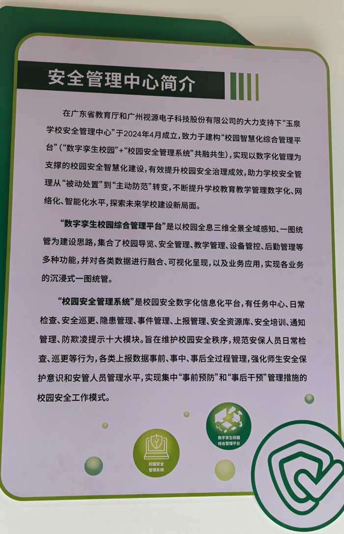 校園安全直接關系到青少年學生能否健康地成長,關系到學校教育教學工作能否正常開展,同時也關系到家庭的幸福安寧和社會穩定。據介紹,玉泉學校一直致力于為廣大師生營造安全和諧的工作、學習和生活環境。2023年,學校被廣東省校園安全教育與管理協會評為“廣東省學校安全教育基地”,這是全省第一所安全教育基地學校。伴隨著教育數字化的加速推進和人工智能技術的發展應用,學校也與希沃在校園安全上開展深度合作,共建“玉泉學校安全管理中心”。