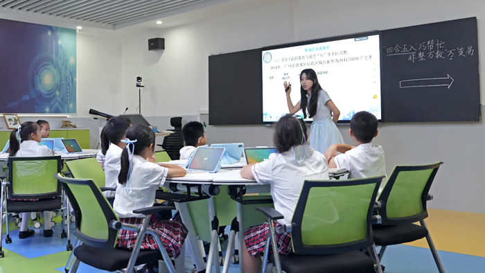 參訪(fǎng)期間,代表團(tuán)走進(jìn)由東薈花園小學(xué)與希沃?jǐn)y手共建的“未來(lái)課室”,親身體驗(yàn)人工智能賦能課堂教學(xué)的創(chuàng)新模式。在四年級(jí)數(shù)學(xué)《“四舍五入”巧幫忙 非整萬(wàn)數(shù)變“萬(wàn)”易》示范課中,教師依托希沃AI智能教學(xué)工具,通過(guò)生活化情境創(chuàng)設(shè)、實(shí)時(shí)互動(dòng)反饋與學(xué)情數(shù)據(jù)采集,成功構(gòu)建以學(xué)生為中心的高效智慧課堂,充分體現(xiàn)人工智能技術(shù)與學(xué)科教學(xué)的有機(jī)融合。