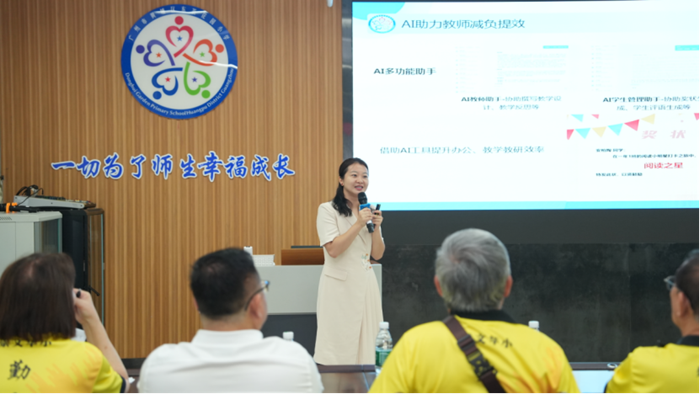 在專(zhuān)題分享環(huán)節(jié),東薈花園小學(xué)李曉宇校長(zhǎng)以《“從單點(diǎn)突破到全面賦能”——數(shù)智驅(qū)動(dòng)五育融合評(píng)價(jià)案例》為題,介紹學(xué)校在數(shù)智驅(qū)動(dòng)五育融合評(píng)價(jià)方面的探索,從率先引入 AI 智慧體育系統(tǒng)設(shè)備,到逐步建立起覆蓋德智體美勞五育并舉的完整數(shù)智化評(píng)價(jià)生態(tài)。劉潔凝主任分享《東薈教育新生態(tài):數(shù)智賦能下的教育迭變》,系統(tǒng)介紹了學(xué)校通過(guò)深化校企合作,構(gòu)建“AI工具嵌入—數(shù)據(jù)驅(qū)動(dòng)—反哺優(yōu)化”教師發(fā)展機(jī)制,全面推動(dòng)備課、授課、教研與評(píng)價(jià)環(huán)節(jié)的數(shù)字化轉(zhuǎn)型。