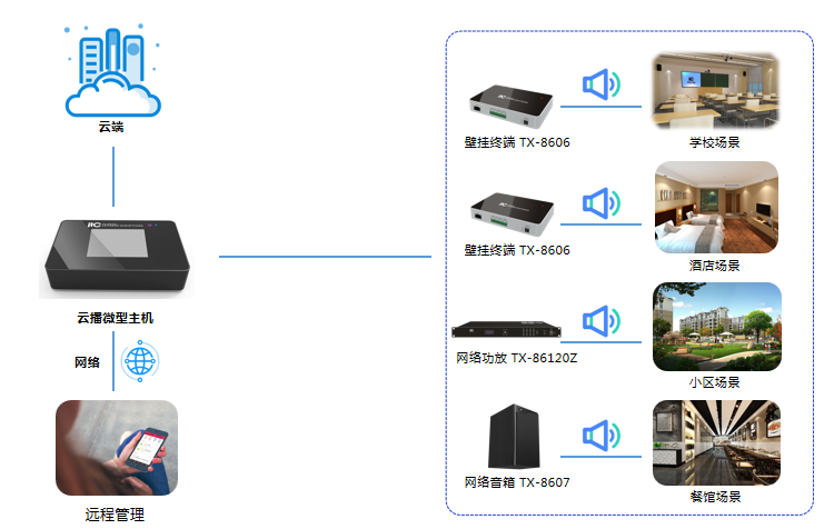 itc云播系統,是針對酒店、幼小學、餐廳、酒店、社區公園等小型應用場景打造的一套廣播系統解決方案,具有網絡化、APP化、高保真、低延時等系統特點。
