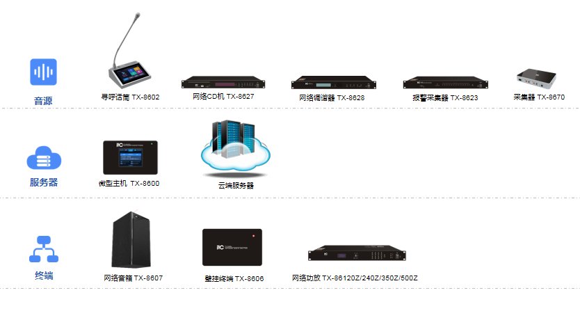 云播系統的可以分為三個產品系列,分別是音源系列、服務器系列和終端系列。