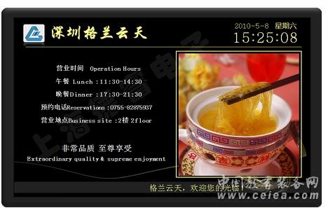 多功能廳門口安裝1臺43英才的高分辨率高清晰度的等離子顯示屏。 通過合理的位置分配后,該系統(tǒng)可與客戶很好的集成在一起,可實現(xiàn)客人前臺登記完畢后到房間就可以看到歡迎信息,也可與收銀臺匯率顯示控制結(jié)合起來。實施信 息發(fā)布系統(tǒng)以后,可以很好的協(xié)作各部門解決很多的問題,可大大的降低成本提高效率,發(fā)布每天的宴會資訊、酒店宣傳信息的同時還可發(fā)布天氣預(yù)報、匯率信息、 客戶產(chǎn)品新聞發(fā)布會議等,這些都可以及時的發(fā)布到指定的顯示終端上。