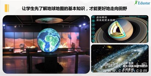 王秋平認為,研學出發前,應該讓學生先充分了解地球地圖知識,才能更好地走向田野。中教啟星的數字星球系統通過國際先進的三維圖像處理平臺,結合精密光學技術,能夠瞬間將圖片、視頻、動畫等多媒體資源展示于數字化球形投影屏幕上,動態立體的再現自然科學和社會科學的現象與過程,是幫助學生直觀形象地認識地球、學習地圖知識的重要工具。