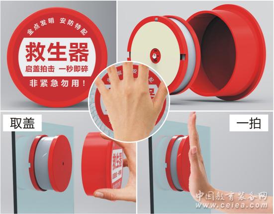 一種按壓式的小盒子,內(nèi)含有擊穿玻璃的鎢鋼合金釘,粘貼在公交車玻璃窗角。使用時,打開保險蓋,用手拍擊,即可實(shí)現(xiàn)逃生。此產(chǎn)品由深圳中發(fā)明科技開發(fā)有限公司研發(fā),通過大量實(shí)驗(yàn),能在1秒鐘時間快速1次實(shí)現(xiàn)破窗救生。老人、小孩、女士均可使用。