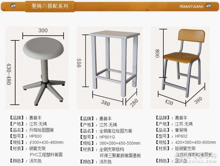2、HP800 升降繪圖凳 規格(∮×H): ∮300×430-480mm 采用PVC工程塑料淺灰色凳座面,凳面厚6mm;采用鋼管支架,管身鋼材厚度為1mm烤漆處理;底坐為五錐腳,平穩牢固,高度為43-48cm,適合制圖教室常用凳子之一。