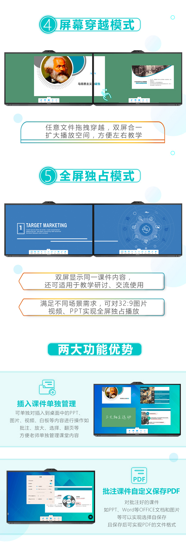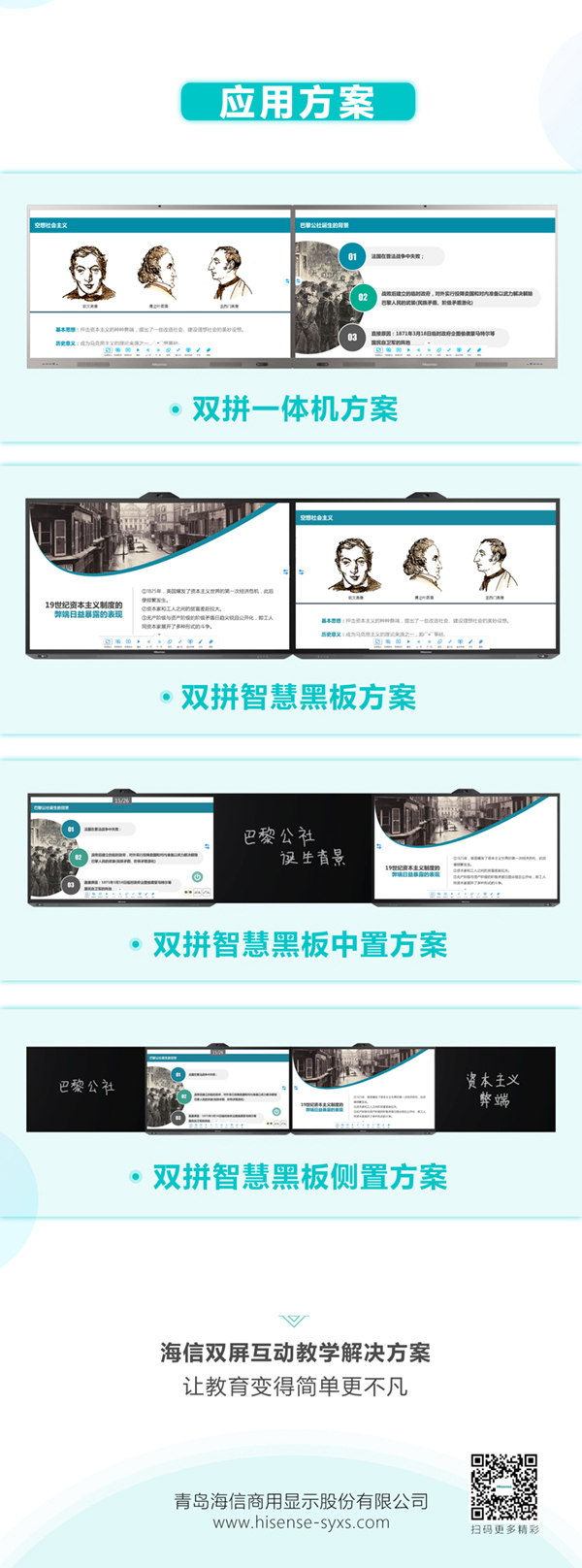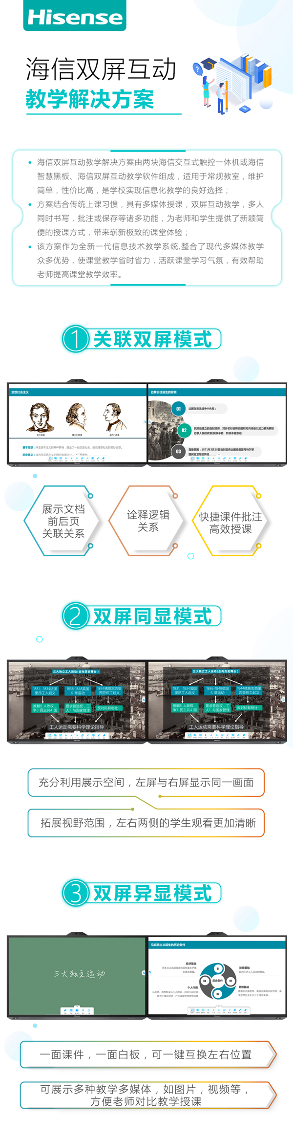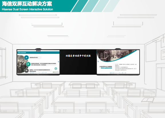 海信雙屏互動教學解決方案,由兩塊海信智慧黑板、海信雙屏互動教學軟件組成,用于常規教室,維護簡單;方案結合傳統上課習慣,具有多媒體授課,雙屏互動教學,雙屏異顯、雙屏聯動、屏幕穿越等諸多功能,為老師和學生提供新穎簡便的授課方式,帶來嶄新極致的課堂體驗;使課堂教學省時省力,活躍課堂學習氣氛,有效幫助老師提高課堂教學效率。