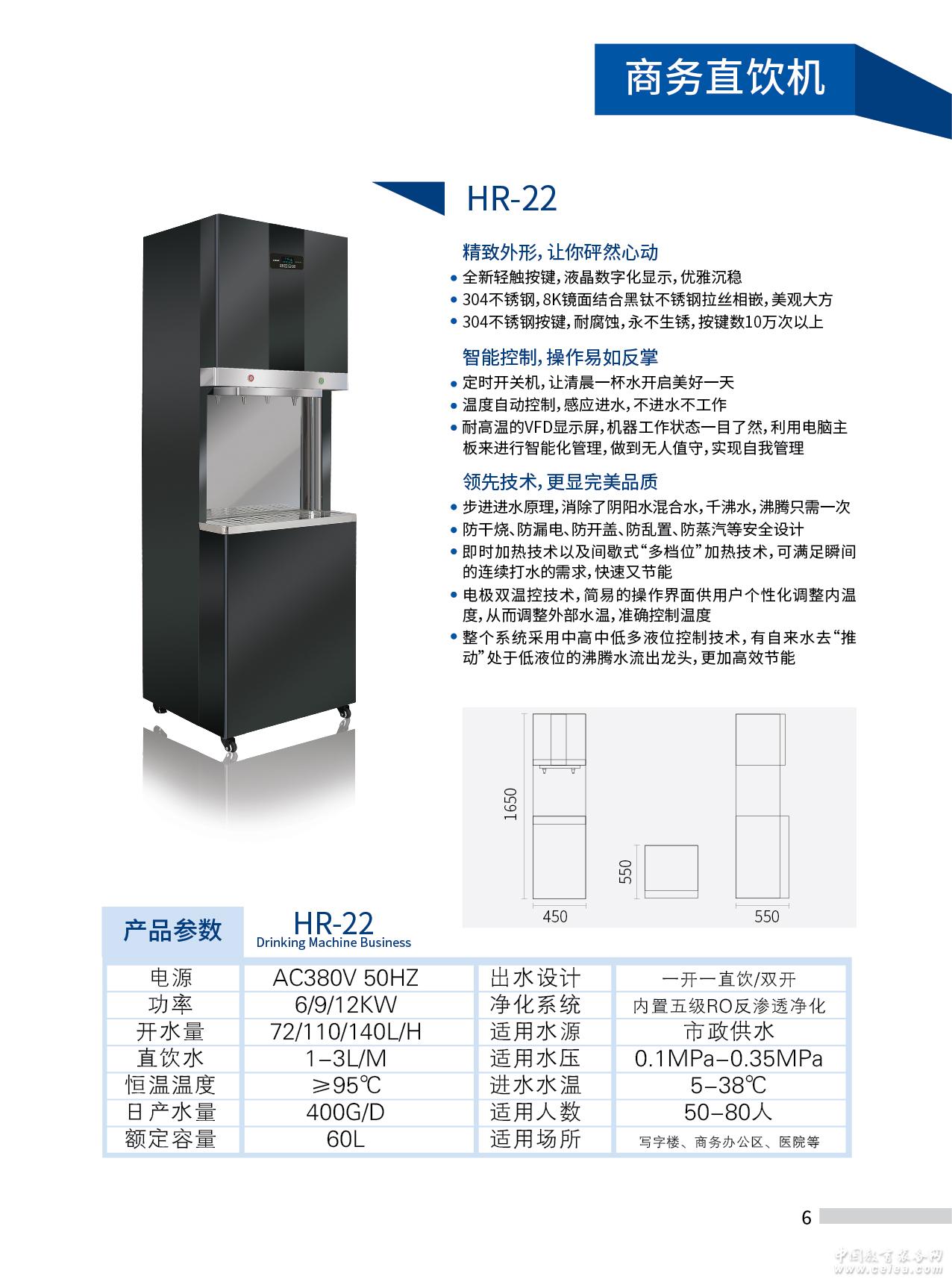 產品詳細介紹校園直飲水 泉升HR系列 額定電壓:220-380V 額定功率:3-12KW 尺寸:50*50*165cm 凈化系統(tǒng):400-800G反滲透凈化系統(tǒng),內置6-11G壓力桶