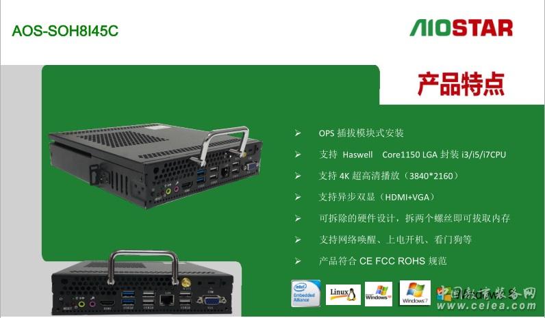 1概述編輯 Aiostar OPS 全稱為:Aiostar Open Pluggable Specification,開放式可插拔規范。是Intel與顯示器廠商共同制定的標準化數字標牌接口規范。OPS內部組成是一個X86架構的迷你PC,采用英特爾酷睿處理器,配有內存、硬盤、多種輸入輸出接口以及Windows操作界面,尺寸為200mm x 119mm x 30mm 。 以下為Intel 官網對于OPS的定義: 原文如下: Digital Signage Open Pluggable Specification :Simplify digital signage development Highlights Enables easier installation, use and maintenance of digital signs. Makes digital signage devices more intelligent and connected. Overview The open pluggable specification (OPS) helps standardize the design and development of digital signage devices and pluggable media players. Intel created OPS to address digital signage market fragmentation and simplify device installation, usage, maintenance and upgrades. OPS enables digital signage manufacturers to deploy interchangeable systems faster and in higher volumes, while lowering costs for development and implementation. Installing digital signage equipment based on Intel architecture helps you implement scalable digital signage applications that can network easily with other equipment. This simplifies interoperability and application upgrades designed to meet the digital signage requirements of individual customers, while helping to future-proof technology investments.[1] 譯文: 強調 更便于安裝、使用和維護的數字信號。 使數字看板設備更智能和融合。 概述 開放的可插拔的規范(OPS)有助于規范的設計和開發數字看板設備,并插入媒體播放器終端。Intel創造OPS 致力于數字看板市場分化和簡化設備安裝、使用、維護和升級。 OPS可以使數字看板制造商更快部署大量的交互系統,同時降低開發和實現的成本。 安裝基于英特爾架構的數字標牌設備可以幫助您實現可伸縮的數字看板應用程序,并且很容易和其他設備進行網絡連接。這簡化了通過交互和升級的設計來滿足個人客戶的數字看板需求,同時有利于面向未來的技術投資。 2特點編輯 1、支持數字標牌等行業最新的OPS規范的電腦模塊,加速數字標牌行業的標準化趨勢。 2、OPS模塊可以簡化設備的安裝、使用、維護和更新,幫助數字標牌制造商降低開發和實施成本。 3、OPS可簡便地與其它設備聯網,可擴展數字標牌應用,滿足數字標牌對交互和應用更新的需求。 4、部分OPS平臺支持遠程管理及低功耗模式,解決耗電及散熱要求。同時平臺所支持的Intel vPro、AMT遠程管理技術,實現設備無人操控下的高效運作。如采用四代i5+Q87平臺的AOS-SOQ8I45A 5、OPS無風扇散熱設計,提供超靜音的解決方案,保證工作環境的安靜、清爽。發熱量小也帶來了較小的功耗。 3整機編輯 Intel 2011年提出該規范后,伴隨著日本NEC OPS接口顯示器的上市,傳統數字標牌嵌入式主板走下神壇,OPS模塊化正式開啟。代表作品有 愛鑫微電子(AIOSTAR) AOS-SOH8I45A ,