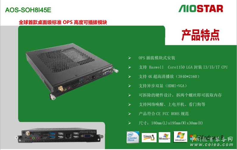 Aiostar OPS 全稱為:Aiostar Open Pluggable Specification,開放式可插拔規范。是Intel與顯示器廠商共同制定的標準化數字標牌接口規范。OPS內部組成是一個X86架構的迷你PC,采用英特爾酷睿處理器,配有內存、硬盤、多種輸入輸出接口以及Windows操作界面,尺寸為200mm x 119mm x 30mm 。 以下為Intel 官網對于OPS的定義: 原文如下: Digital Signage Open Pluggable Specification :Simplify digital signage development Highlights Enables easier installation, use and maintenance of digital signs. Makes digital signage devices more intelligent and connected. Overview The open pluggable specification (OPS) helps standardize the design and development of digital signage devices and pluggable media players. Intel created OPS to address digital signage market fragmentation and simplify device installation, usage, maintenance and upgrades. OPS enables digital signage manufacturers to deploy interchangeable systems faster and in higher volumes, while lowering costs for development and implementation. Installing digital signage equipment based on Intel architecture helps you implement scalable digital signage applications that can network easily with other equipment. This simplifies interoperability and application upgrades designed to meet the digital signage requirements of individual customers, while helping to future-proof technology investments.[1] 譯文: 強調 更便于安裝、使用和維護的數字信號。 使數字看板設備更智能和融合。 概述 開放的可插拔的規范(OPS)有助于規范的設計和開發數字看板設備,并插入媒體播放器終端。Intel創造OPS 致力于數字看板市場分化和簡化設備安裝、使用、維護和升級。 OPS可以使數字看板制造商更快部署大量的交互系統,同時降低開發和實現的成本。 安裝基于英特爾架構的數字標牌設備可以幫助您實現可伸縮的數字看板應用程序,并且很容易和其他設備進行網絡連接。這簡化了通過交互和升級的設計來滿足個人客戶的數字看板需求,同時有利于面向未來的技術投資。 2特點編輯 1、支持數字標牌等行業最新的OPS規范的電腦模塊,加速數字標牌行業的標準化趨勢。 2、OPS模塊可以簡化設備的安裝、使用、維護和更新,幫助數字標牌制造商降低開發和實施成本。 3、OPS可簡便地與其它設備聯網,可擴展數字標牌應用,滿足數字標牌對交互和應用更新的需求。 4、部分OPS平臺支持遠程管理及低功耗模式,解決耗電及散熱要求。同時平臺所支持的Intel vPro、AMT遠程管理技術,實現設備無人操控下的高效運作。如采用四代i5+Q87平臺的AOS-SOQ8I45A 5、OPS無風扇散熱設計,提供超靜音的解決方案,保證工作環境的安靜、清爽。發熱量小也帶來了較小的功耗。 3整機編輯 Intel 2011年提出該規范后,伴隨著日本NEC OPS接口顯示器的上市,傳統數字標牌嵌入式主板走下神壇,OPS模塊化正式開啟。代表作品有 愛鑫微電子(AIOSTAR) AOS-SOH8I45A ,