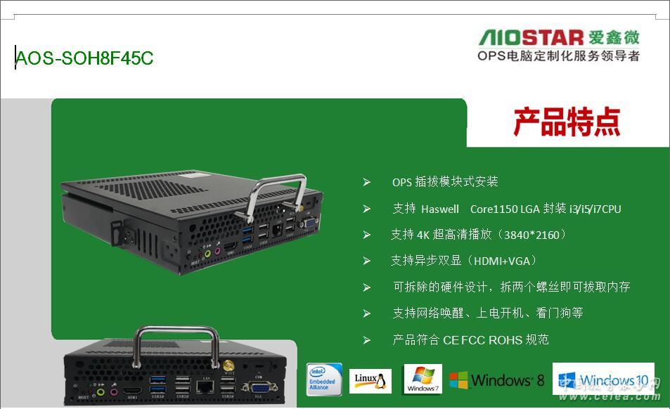 產品詳細介紹深圳市愛鑫微電子有限公司為更好的配合不同廠家的要求,可提供OPS主板與OPS準系統的方案配合各個廣告機,觸控一體機廠家,多媒體壁掛式教學一體機,數字標牌,錄播觸控一體機,同時保證所提供OPS主板與OPS插拔式電腦/OPS-C插拔式電腦主機是完全按照INTEL OPS規范定義的,完全支持鴻合教育一體機、東方中原教育一體機、創維教育一體機、康佳教育一體機、中銀液晶觸控一體機、中電數碼教育一體機、海爾觸控一體、TCL觸控一體機、KTC/HKC/HPC等各大交互式教育觸控一體機廠家,愛鑫微電子提供專業的定制化服務OEM/ODM. 聯系電話:18620397178 QQ:46078934 現階段我司已推出了一系列OPS電腦方案如下: 頂極OPS插拔式電腦方案:H110+6代CPU+2G獨立顯卡(GT730/GT850/GT950) 高端:H110+6代CPU (市場最新方案 4K極清方案)歡迎客戶取樣測試。支持4組USB3.0+3組USB2.0+3組異步顯示(VGA+HDMI+DP)+3組網口(可以直接接IP攝像機進行錄播與監控或者網絡內外網隔離進行封標) 中高端:H81+4代CPU/HM86+4-5代CPU(市場主流) 中端:H61+2-3代CPU/HM65+2-3代CPU(高性價比) 低端:baytrailJ1800/J1900無風扇低成本的OPS電腦(幼教觸控一體機專用) 深圳市愛鑫微電子有限公司(以下簡稱“AIOSTAR”)是一家集研發、生產和銷售于一體的高新技術企業,同時是Intel、AMD、NVIDIA等芯片廠商緊密的合作伙伴。公司主營工業主板(ITX/3.5寸/NANO等)、媒體播放主機、OPS主機、OPS可插拔式電腦模塊、OPS主板、BOX-PC、網絡安全硬件平臺、服務器、工業平板電腦、一體化工作站等產品。目前,產品已廣泛應用于DS、MIDS、IWB、POS、自助查詢、零售金融、工業自動化,智能交通,網絡信息安全,通訊、智能安防,云計算、石油石化、醫療、軍事裝備等多個領域。公司高度重視客戶的需求和滿意度,針對不同的客戶需求,能夠快速做出積極的響應,為其進行量身設計并提供個性化的OEM/ODM服務。 愛鑫微電子本著以“人才是企業的財富,效益是追求的目標,發展是永恒的主題”為宗旨;以“客戶至上,品質為尊“為原則;提倡“博愛”“齊鑫”“微天下”的意愿,愿與全球各地的企業商家攜手合作,共謀發展! 規格參數 處理器 CPU Intel英特爾 Core酷睿 i5-4460 (雙核四線程/3.2GHz/3MB三級緩存/HD4400/22nm/54W/LGA1150) 芯片組 Intel® H81/B85 BIOS AMI 32Mbit,支持無盤啟動、網絡喚醒、上電開機、看門狗等功能 內存 容量 4GB SO-DIMM DDR3 1333 MHz memory , Max.8GB 存儲 SATA接口 MINI PCIE 2.5〞5400rpm 500G 1xMini PCIE 顯示 芯片組 輸出
