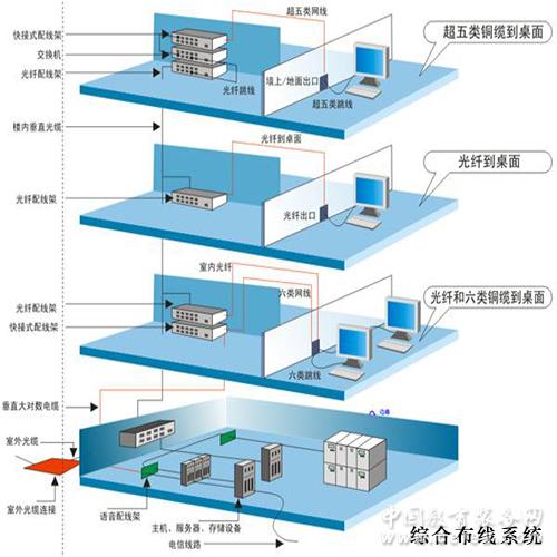垂直干線子系統(tǒng) 目的是實(shí)現(xiàn)計(jì)算機(jī)設(shè)備、程控交換機(jī)(PBX)、控制中心與各管理子系統(tǒng)間的連接,是建筑物干線電纜的路由。該子系統(tǒng)通常是兩個(gè)單元之間,特別是在位于中央點(diǎn)的公共系統(tǒng)設(shè)備處提供多個(gè)線路設(shè)施。系統(tǒng)由建筑物內(nèi)所有的垂直干線多對(duì)數(shù)電纜及相關(guān)支撐硬件組成,以提供設(shè)備間總配線架與干線接線間樓層配線架之間的干線路由。常用介質(zhì)是大對(duì)數(shù)雙絞線電纜和光纜。 干線的通道包括開(kāi)放型和封閉型兩種。前者是指從建筑物的地下室到其樓頂?shù)囊粋(gè)開(kāi)放空間,后者是一連串的上下對(duì)齊的布線間,每層各有一間,電纜利用電纜孔或是電纜井穿過(guò)接線間的地板,由于開(kāi)放型通道沒(méi)有被任何樓板所隔開(kāi),因此為施工帶來(lái)了很大的麻煩,一般不采用。 設(shè)備室子系統(tǒng) 本子系統(tǒng)主要是由設(shè)備間中的電纜、連接器和有關(guān)的支撐硬件組成,作用是將計(jì)算機(jī)、PBX、攝像頭、監(jiān)視器等弱電設(shè)備互連起來(lái)并連接到主配線架上。設(shè)備包括計(jì)算機(jī)系統(tǒng)、網(wǎng)絡(luò)集線器(Hub)、網(wǎng)絡(luò)交換機(jī)(Switch)、程控交換機(jī)(PBX)、音響輸出設(shè)備、閉路電視控制裝置和報(bào)警控制中心等。 建筑群干線子系統(tǒng)圖 該子系統(tǒng)將一個(gè)建筑物的電纜延伸到建筑群的另外一些建筑物中的通信設(shè)備和裝置上,是結(jié)構(gòu)化布線系統(tǒng)的一部分,支持提供樓群之間通信所需的硬件。它由電纜、光纜和入樓處的過(guò)流過(guò)壓電氣保護(hù)設(shè)備等相關(guān)硬件組成,常用介質(zhì)是光纜。 建筑群子系統(tǒng)布線有以下三種方式: 地下管道敷設(shè)方式:在任何時(shí)候都可以敷設(shè)電纜,且電纜的敷設(shè)和擴(kuò)充都十分方便,它能保持建筑物外貌與表面的整潔,能提供最好的機(jī)械保護(hù)。它的缺點(diǎn)是要挖通溝道,成本比較高。 直埋溝內(nèi)敷設(shè)方式:能保持建筑物與道路表面的整齊,擴(kuò)充和更換不方便,而且給線纜提供的機(jī)械保護(hù)不如地下管道敷設(shè)方式,初次投資成本比較低。 架空方式:如果建筑物之間本來(lái)有電線桿,則投資成本是最低的,但它不能提供任何機(jī)械保護(hù),因此安全性能較差,同時(shí)也會(huì)影響建筑物外觀的美觀性。 |