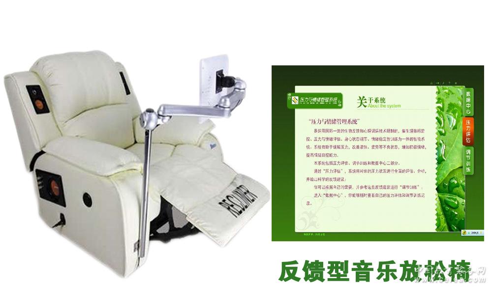 產品詳細介紹 本款椅子帶有的系統采用的是HRV生理指標采集加心理測試結合來分析評估壓力水平,有4套專業的心理健康摸底,系統植入了600多萬專業常模,可以比較準確的生成一套反饋報告,改報告不僅從常規心理學角度來告訴我們怎么釋放壓力,還從日常飲食上也提出了放松的建議。真正的一對一對報告。里面配備了6款心理游戲,包括菩提樹開花偶像 一、【反饋型音樂放松椅】產品描述 1、頭等艙設計開發的進口小牛皮座椅1臺 a.產品尺寸:長105CM×寬90CM×高105CM(椅背收起) 長170CM×寬90CM×高60CM(椅背展開) b.產品重量: 凈重:45KG;最大承載量:100KG, c. 電 源: 220V(50Hz) d.獨立電動控制系統:音樂椅靠背、腿部電動控制設計,靠背100度-180度,腿部90度-180度任意調節。 e.播音系統:內置日本山水高品質音響 2、數字播放系統:15寸觸控播放器 1個:無線遙控器,支持音樂、心理圖片、心理文章、心理電影等多種格式文件(內置心理視聽資料含心理音樂:放松類、激揚類、冥想類、腦波共振類、抒發類、振奮類、中醫五行類、自我催眠類等類別,心理圖片:放松圖、錯覺圖,心理視頻:催眠用搖擺鐘視頻、放松訓練教學視頻、經典眩暈視頻、太空遐想視頻;心理電影:3部,心理小常識:txt文字版38篇) 3、音樂治療指導書籍 1本 4、鋁制萬向顯示器支架 1個(支持方位調節,便于使用者調節顯示器角度,調整到適合自己的位置放置) 5、簡易工具包 1個 (便于顯示器及顯示器支架的安裝) 6、音樂反饋系統 1套