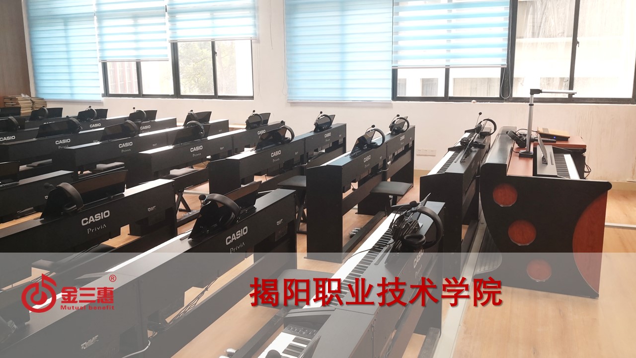 揭陽職業技術學院的電鋼琴教室正式開始使用,本校數字化音樂教室由北京金三惠科技有限公司負責提供、安裝、培訓。