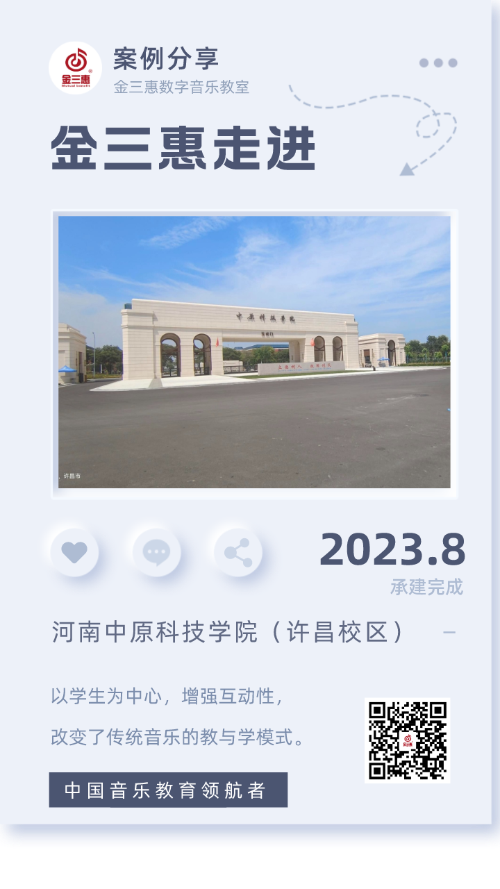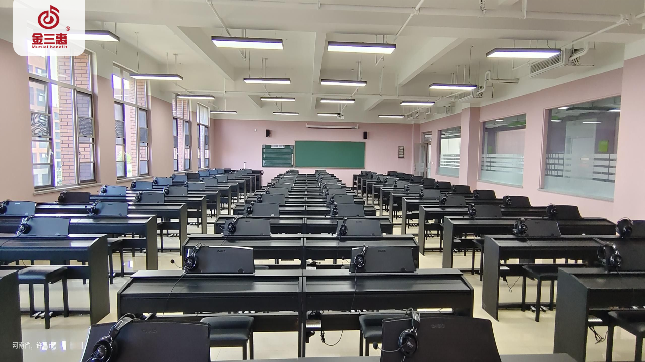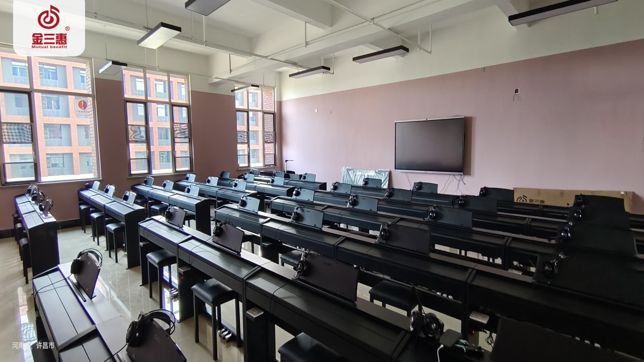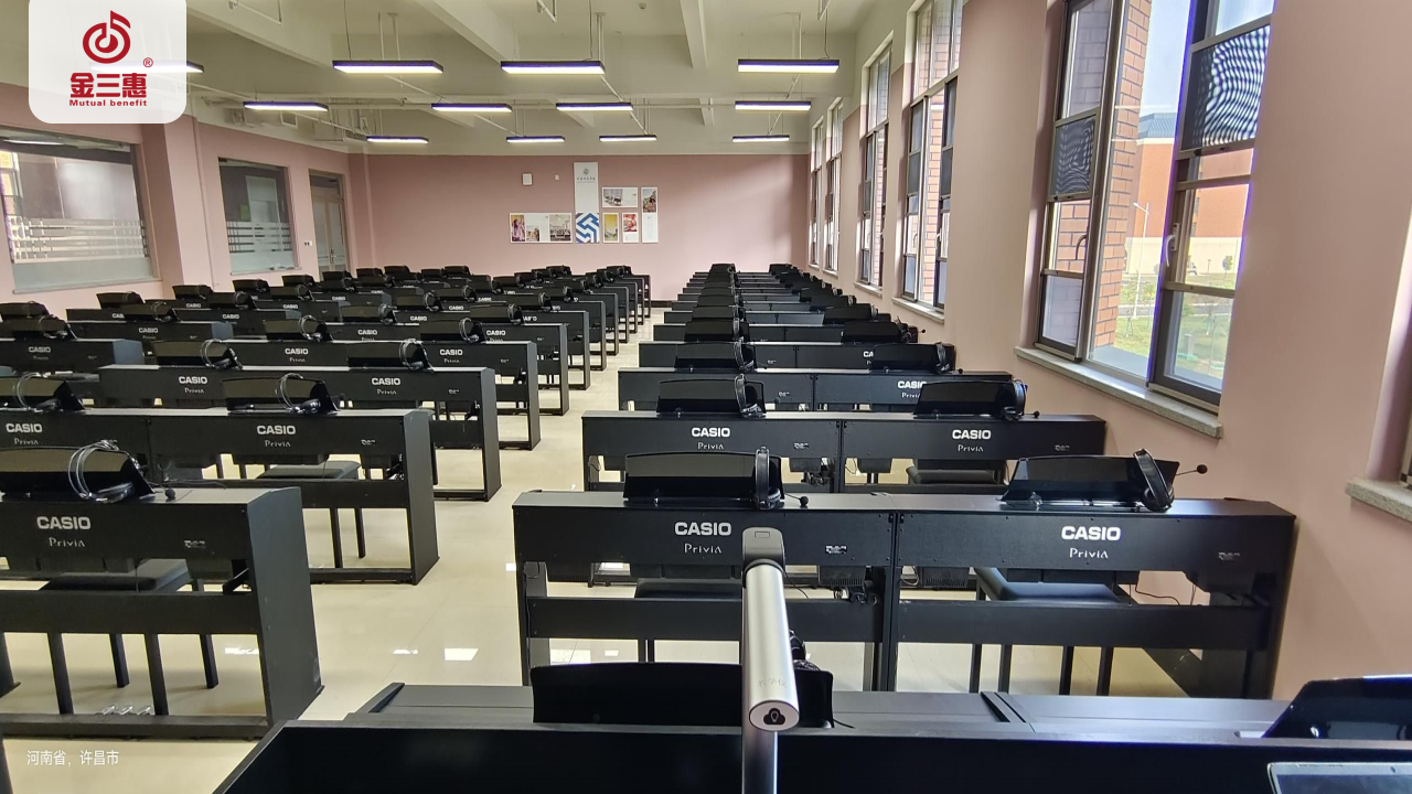 2023年8月,金三惠數字音樂教室走進河南中原科技學院(許昌校區),為學生提供了40+1的電鋼琴教室2套 & 80+1電鋼琴教室2套,配備了金三惠電鋼琴教學系統、電鋼琴、數字音樂教學儀等教學教具等。