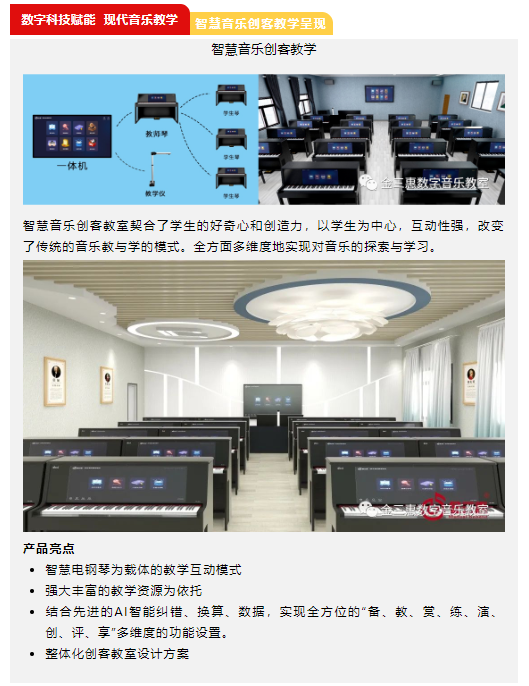 | 金三惠提供一站式「新常態(tài)音樂教室解決方案」「數(shù)字音樂教育綜合解決方案」,熱銷產(chǎn)品有:數(shù)字音樂教學軟件、美育測評訓練平臺、電鋼琴/電子琴教學管理軟件、電鋼琴教室、智慧音樂素養(yǎng)教室、數(shù)字電教板、各大類音樂器材、音樂教學設備等。為區(qū)域音樂教育提供管、教、學、評、練綜合平臺,打造智慧平臺+智能硬件+數(shù)字資源+智能管控+教學評價為一體的全場景學習生態(tài),實現(xiàn)區(qū)域數(shù)字化音樂教育轉(zhuǎn)型。 |