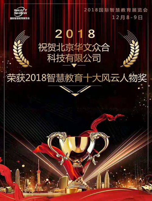 2018年12月8日,北京華文眾合科技有限公司參加SmartShow2018 中國國際智慧教育展覽會,繼此前華文眾合獲得“2018校園好方案”優秀案例榮譽后,華文眾合總裁向大鳳榮獲2018智慧教育十大風云人物獎。