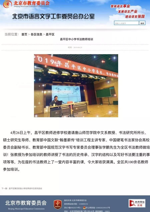 日前,教育部中國文聯(lián)“翰墨薪傳”培訓工程主講專家、教育部中國規(guī)范漢字書寫專家委員會理事、華文眾合硬筆書法教學首席專家、碩士研究生導師張學鵬教授應(yīng)昌平區(qū)教師進修學校邀請,為全區(qū)書法教師做培訓。