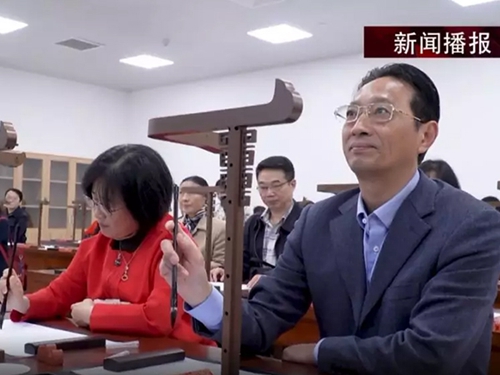 教育部離退休干部局黨委書記、局長于虹(左)體驗(yàn)華文眾合智慧書法教室