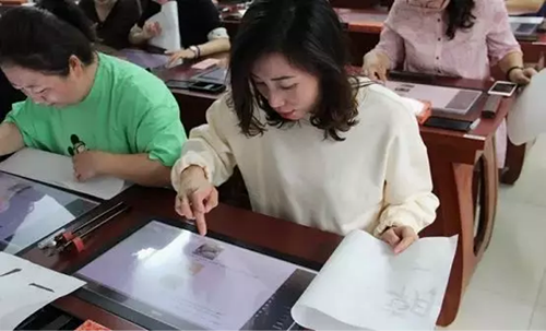 培訓過程中,講師通過華文眾合智慧書法教室的多維互動系統與直播系統,將書寫示范與其中一位老師的書寫過程,高清同步到每位老師面前的交互式數字臨摹臺上,并在電腦上現場進行圈點、評價。在臨摹臺上,老師們用毛筆蘸著墨汁,鋪上普通宣紙就可以進行書寫,防水、耐磨、自適應調節(jié)亮度的交互式數字臨摹臺讓老師們眼前一亮。