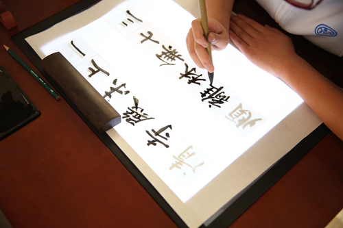 劉書貴說:“書法描摹是掌握漢字結構最有效最直接的一個方法,這一套設備對于初學書法的孩子來說,作用是很大的,尤其是在這個屏幕上臨摹古帖的時候,覆蓋了之后透明度比較高,特別清晰。學生可以直接用毛筆對著這個影子進行描摹,這套設備在這個方面做的比較好!