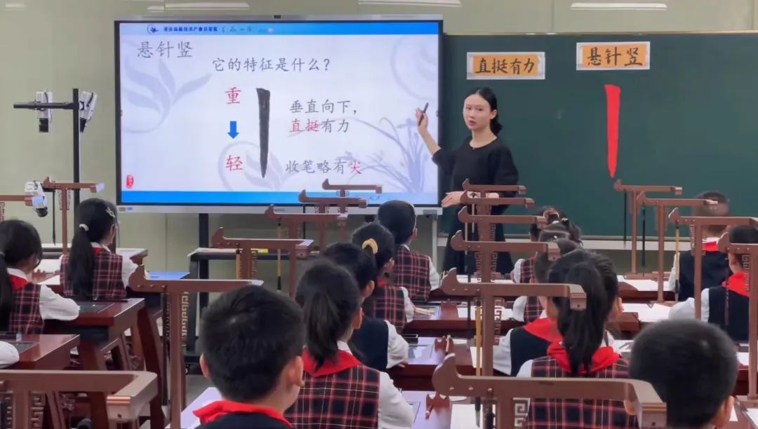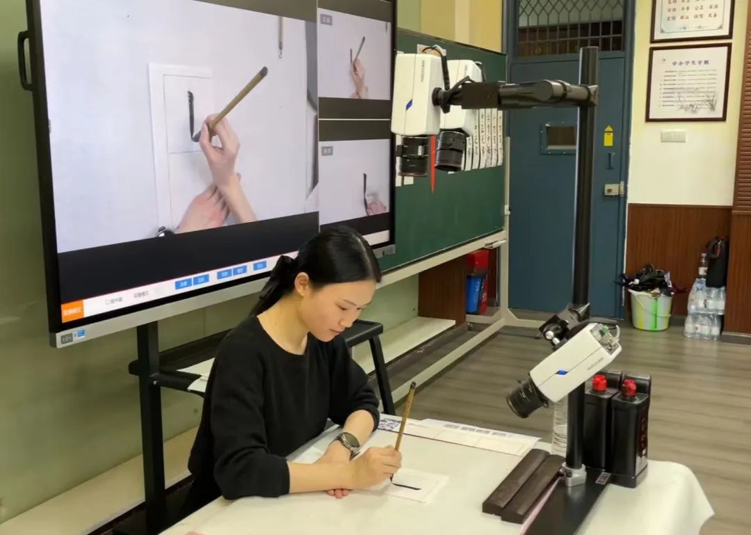 在活動現(xiàn)場,授課教師何悅利用華文眾合智慧書法教室為學生們上了一節(jié)別開生面的書法課”。通過直播授課把“懸針豎”的起筆、行筆、運筆、收筆從三個角度進行展示,并同步到每個學生端;通過互動系統(tǒng)更清晰快速地指導(dǎo)學生的書法練習細節(jié);通過邊看邊練讓學生的書法臨摹變得更高效。應(yīng)用華文眾合智慧書法教室的各項功能,很好地展示了書法教學細節(jié),提升了書法教學質(zhì)量。